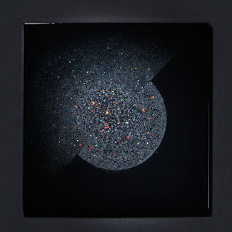 The motifs of the works often reference well-known physics experiments, particles such as atoms, or celestial bodies, all depicted solely with semiconductors. The rainbow-like structural colors of the semiconductor, which shift depending on angle and distance, are contrasted against a black ground to evoke a cosmic worldview, while the reflective resin surface captures the image of the viewer, situating humanity as being surrounded by the uncanny substance of the semiconductor.